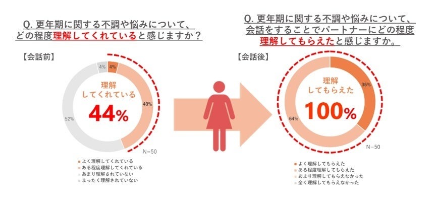更年期について会話をする前は、「夫が理解してくれている」と回答した女性は44%と半分以下で、男性側も更年期を「理解している」と回答したのはわずか26%でした。しかし、更年期について会話をすることで女性の100%が「理解してもらえた」、男性の96%が「理解できた」と回答し、会話によって理解度が大きく改善する結果となりました。