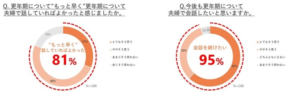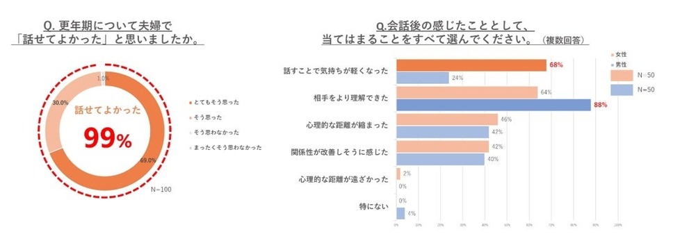 一方で、更年期について夫婦間の会話を行った後、全体の99%が「話せてよかった」と回答し、女性の68%が「気持ちが軽くなった」と答えるなど心理的な負担が和らぐ結果となりました。さらに95%が「今後も会話を続けたい」と答えており、会話が安心感と前向きな関係性の構築につながる重要なきっかけとなることが示されました。